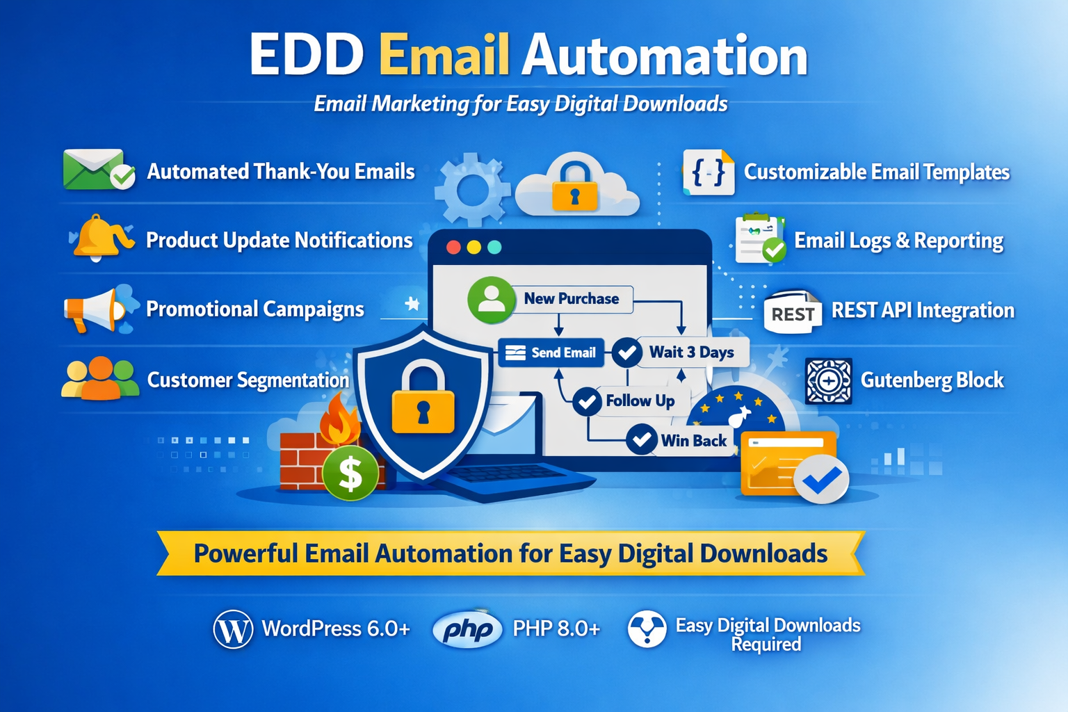 EDD Email Automation is a WordPress plugin for Easy Digital Downloads that automates customer communication. It helps you send thank‑you emails, product updates, promotional campaigns, and more — saving time while improving customer engagement.